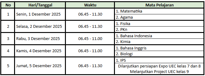 1. Senin - Kamis, 22 - 25 September 2025 : Penilaian Praktik PJOK, TIK, Seni Budaya dan Baskara sesuai jam KBM masing-masing